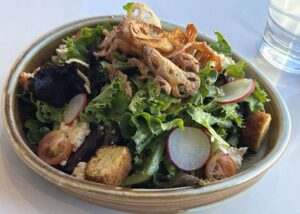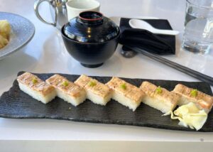 Waterfront, that had gotten lots of positivity online and I knew had fine views of the harbor. We got seated at a fantastic patio table and had terrific sushi, sashimi, tofu salad, miso soup and calamari. Server Jada made great recommendations for the web gal.