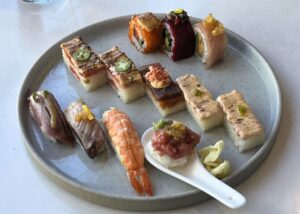 Waterfront, that had gotten lots of positivity online and I knew had fine views of the harbor. We got seated at a fantastic patio table and had terrific sushi, sashimi, tofu salad, miso soup and calamari. Server Jada made great recommendations for the web gal.
