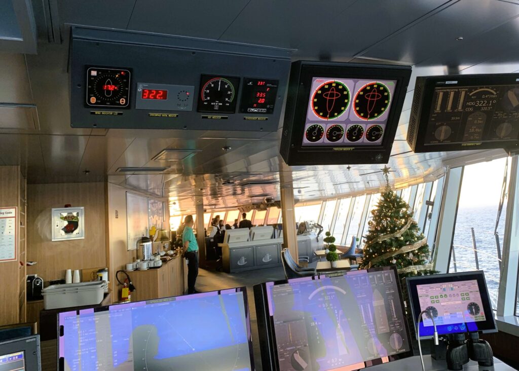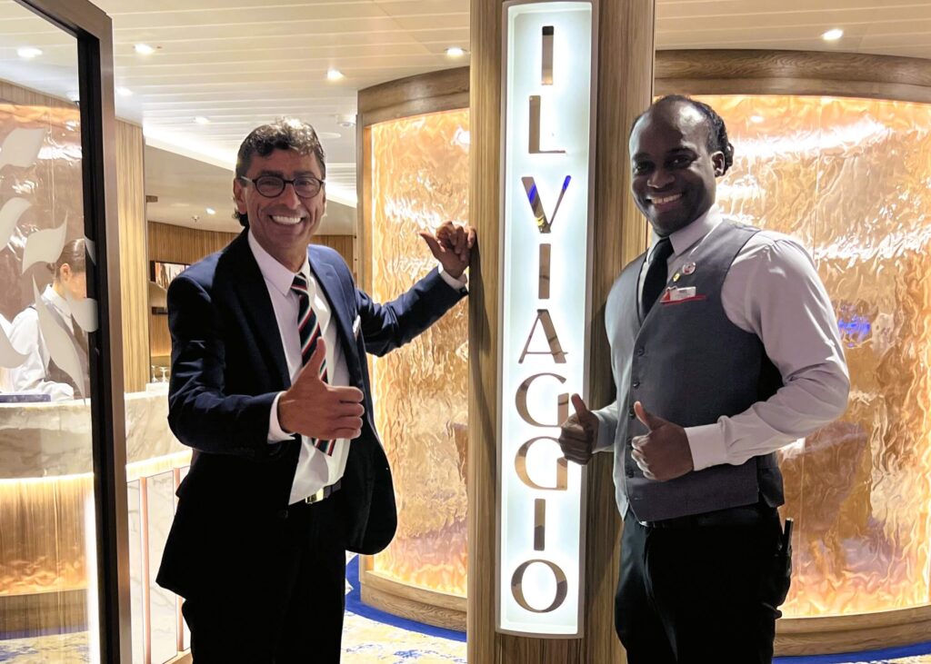 After getting the ship’s Hotel Director, Jack McCaugherty, to do the NSI quiz, word must have gone upstairs that we were a fun couple, Captain Crescenzo Palomba invited us to an afternoon tea. Beautiful views from the bridge and our captain was a fine host. Had a blast that night when he came down and took pics at the Chef’s Table tasting menu dinner in the galley of the ship’s kitchen.