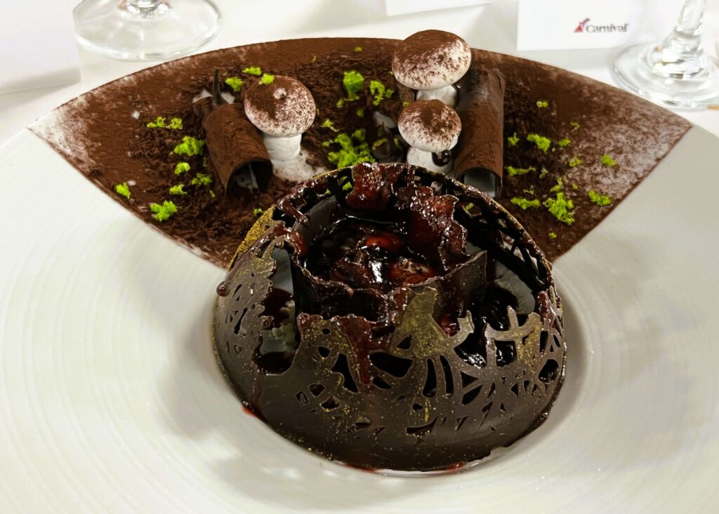 A night later, with the aid of the ship’s terrific, genial Guest Service Manager, Victor Flores, we booked for a dinner at Fahrenheit 555, the Firenze ship’s steakhouse. What a treat. Got treated like royalty throughout the dinner. Had a nice dining conversation with a lady diner who was actually an on-site inspector for Carnival, evaluating everything from the food to the service. Loved our Spice Rubbed USDA Prime Ribeye steak, some nice spice on the meat, without it being overpowering and paired nicely with Duckhorn Merlot. Cooked to rare perfection. And everything else was fine too. Lobster was incredible. Normally give lobster a pass, but the web gal insisted lobster was delicious, and she was right. Wine, dessert, everything clicked.