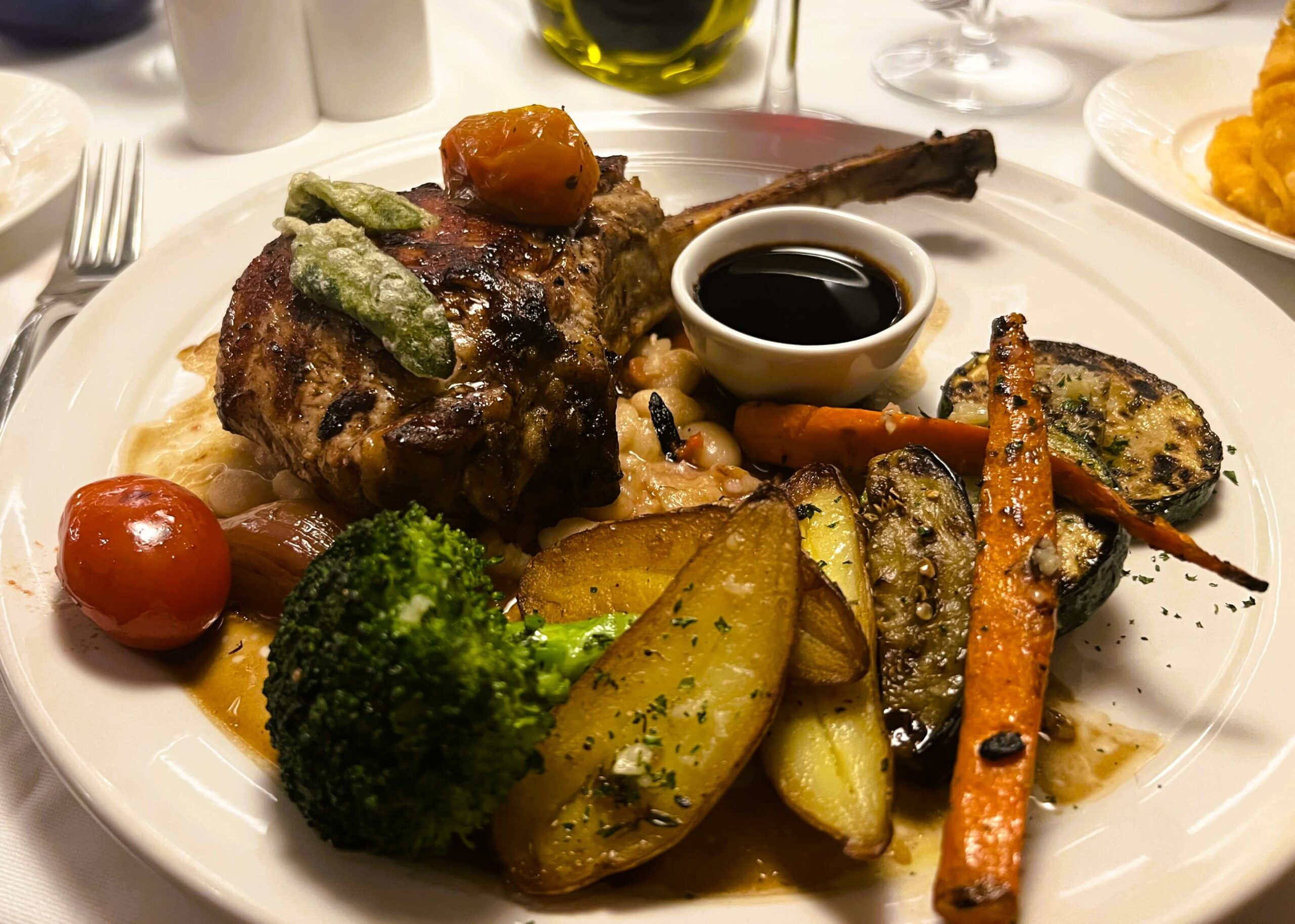 On our last night on the ship, dined at their premier Italian restaurant Il Viaggio. Made the mistake of not telling our waiter that I like my pork a little pink. Really impressed when a captain came by and asked how were things and I told him my preference for pink pork. He took my plate away no problem and within ten minutes had a delicious, juicy, thick pink pork chop in front of me. Web gal liked her lightly seared prawns. Felt like splurging on our last night and ordered a $100 bottle of Batasiolo Barolo that paired well with the pork and prawns.